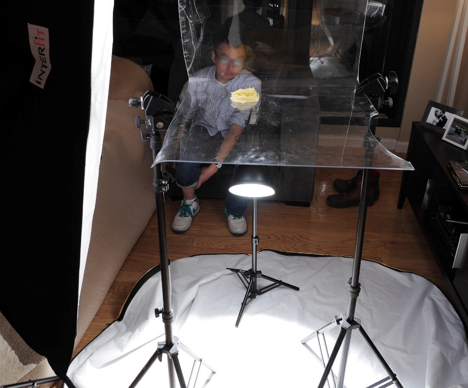 One light for pure white background. The other light for lighting the subject. You can see my Plexiglas glass has undergo a lot of abuse……